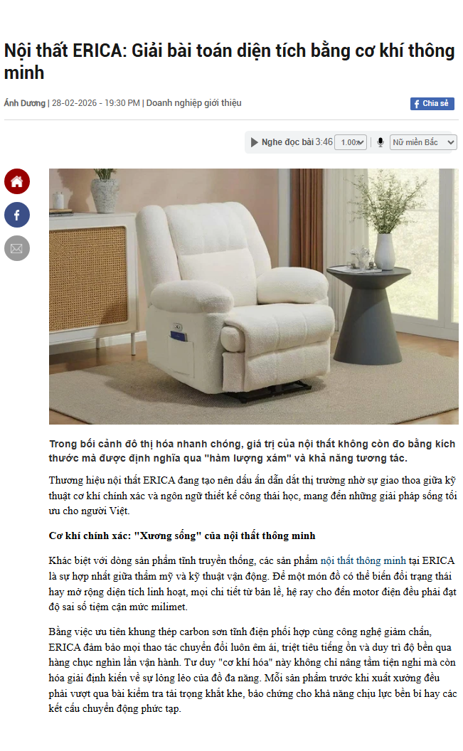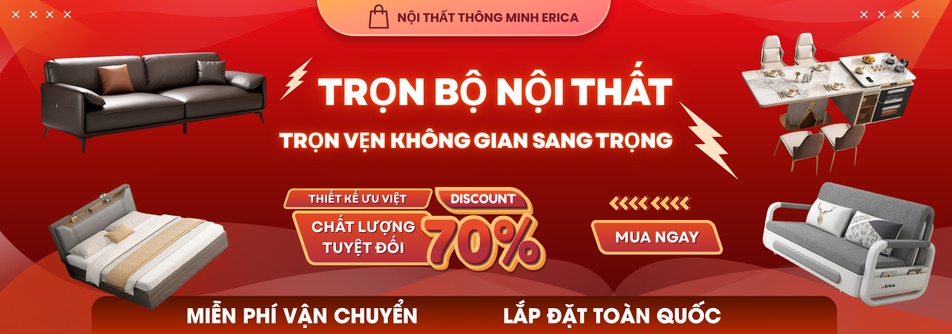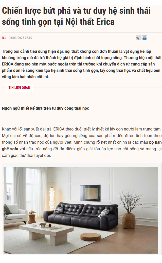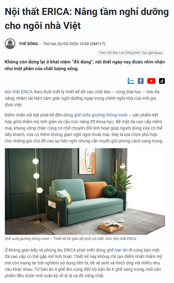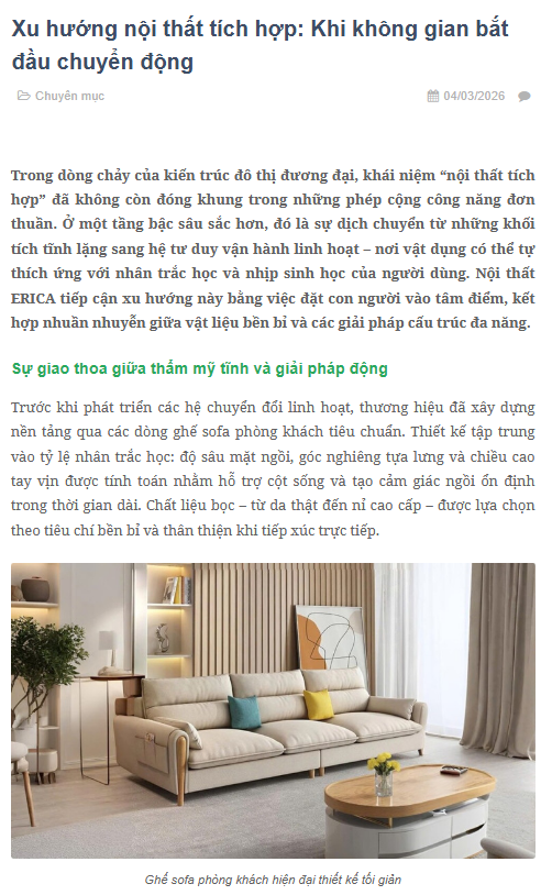 Danh mục sản phẩm của Erica bao gồm sofa giường, sofa phòng khách, giường ngủ, bàn ăn và các dòng nội thất thông minh khác, phù hợp cho gia đình và căn hộ chung cư, giúp tối ưu không gian và nâng cao sự tiện nghi trong sinh hoạt.