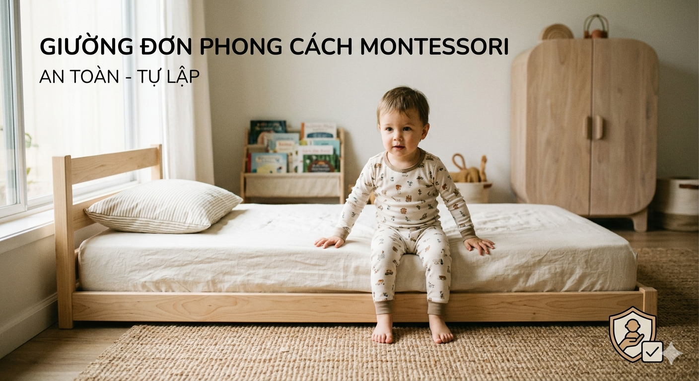 Phong cách Montessori nhấn mạnh vào việc đặt giường sát mặt đất. Điều này giúp trẻ có thể tự do lên xuống giường mà không cần sự trợ giúp của người lớn, đồng thời loại bỏ hoàn toàn nguy cơ ngã từ trên cao.