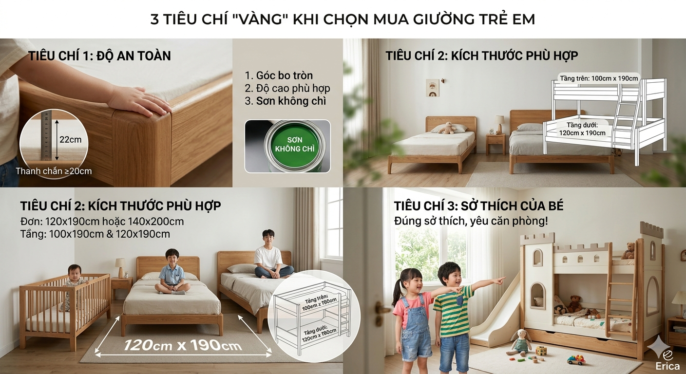 Độ cao: Đối với trẻ nhỏ, nên chọn giường thấp. Với giường tầng, thanh chắn phải cao ít nhất 20cm so với mặt nệm.