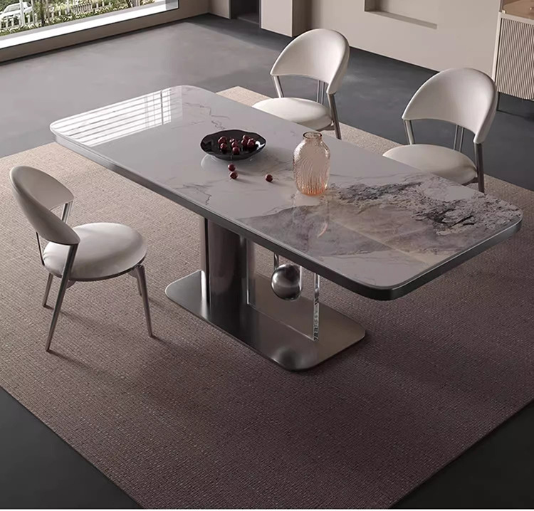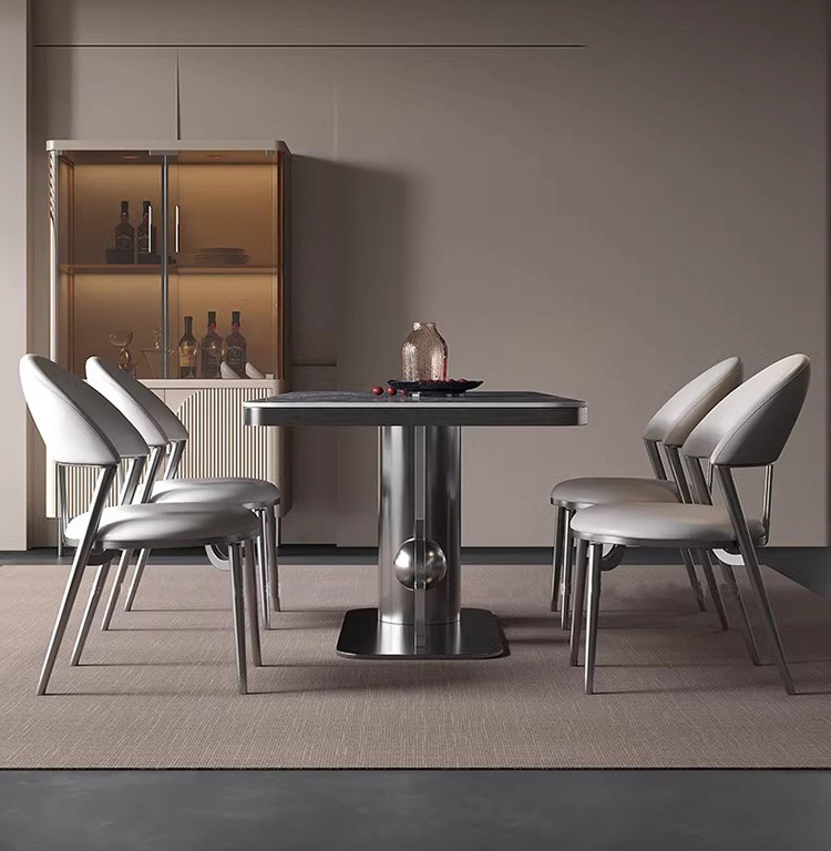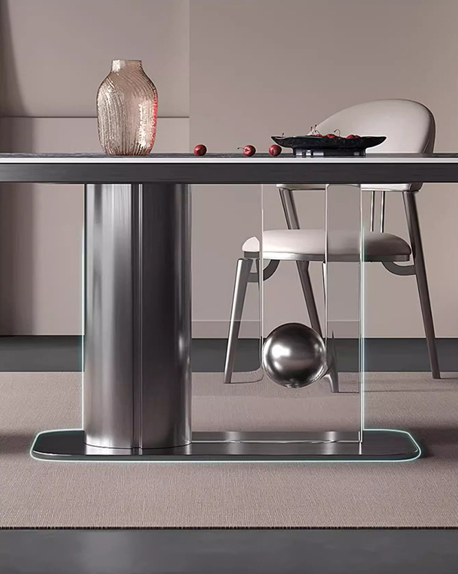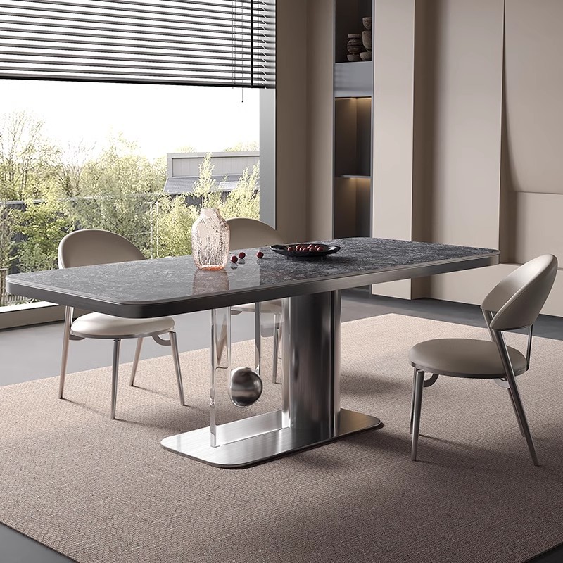 Mặt bàn ăn đẹp hiện đại được chế tác từ đá phiến cao cấp với khả năng kháng khuẩn, chịu nhiệt và chống trầy xước tuyệt vời, mang đến sự tiện nghi và độ bền vượt trội. Chân bàn bằng thép không gỉ 304 chắc chắn, chống oxy hóa và giữ được vẻ sáng bóng lâu dài. Sự kết hợp của hai vật liệu cao cấp tạo nên tổng thể vừa sang trọng, vừa mạnh mẽ.