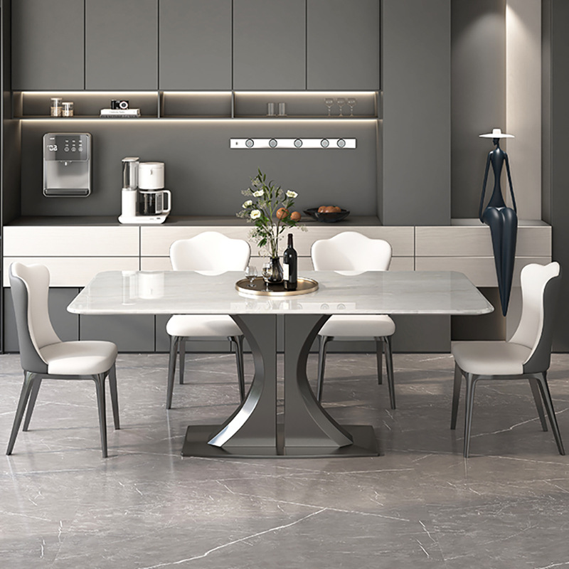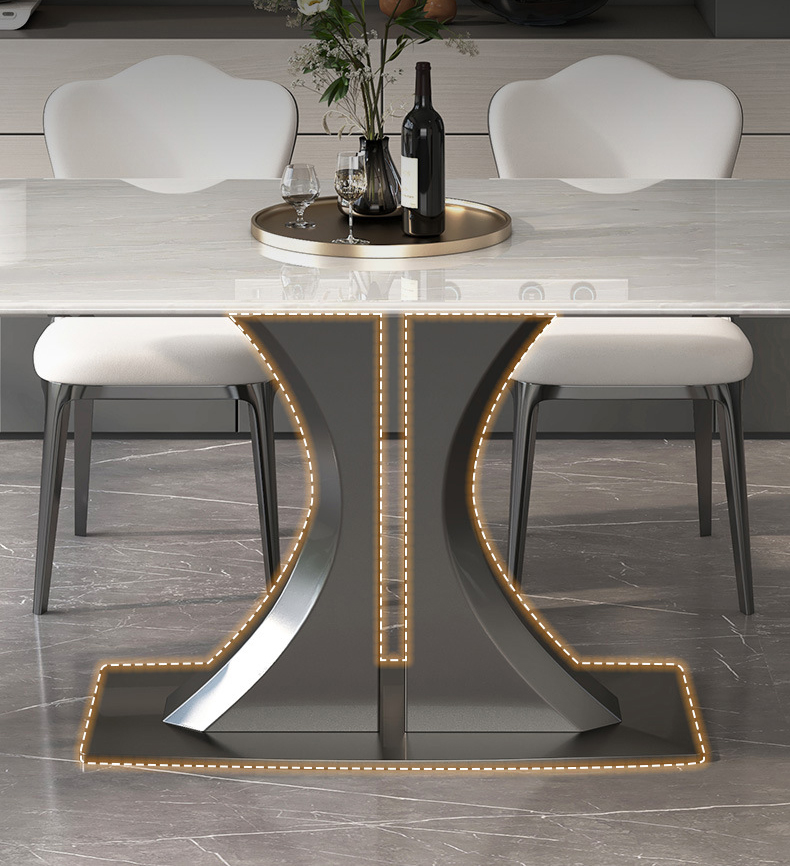 Phần chân bàn bằng thép không gỉ được thiết kế uốn cong mềm mại, vừa tạo điểm nhấn tinh tế vừa đảm bảo độ vững chắc tuyệt đối. Mọi góc cạnh đều được xử lý tỉ mỉ để đem lại sự cân bằng hoàn hảo giữa tính thẩm mỹ và độ bền. Đây chính là yếu tố giúp bộ bàn vừa đẹp vừa bền, vừa tinh tế vừa mạnh mẽ.