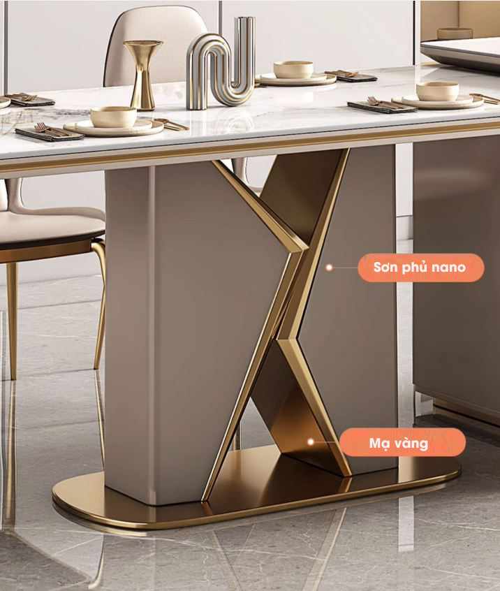 ▪️ Mặt bàn hình chữ nhật, đá trắng vân mây tinh tế, chân trụ bắt mắt giàu tính nghệ thuật, tạo nên tổng thể siêu cuốn hút. ▪️ Tone màu trắng & vàng được ưu tiên sử dụng trong thiết kế của sản phẩm. Với ưu điểm là ứng dụng tốt và tính thời trang bền vững, khó lỗi mốt. ▪️ Các cạnh góc được bo tròn, đánh bóng kỹ lưỡng, cho cảm giác mềm mịn, không làm đau tay, an toàn tuyệt đối mỗi khi sử dụng.