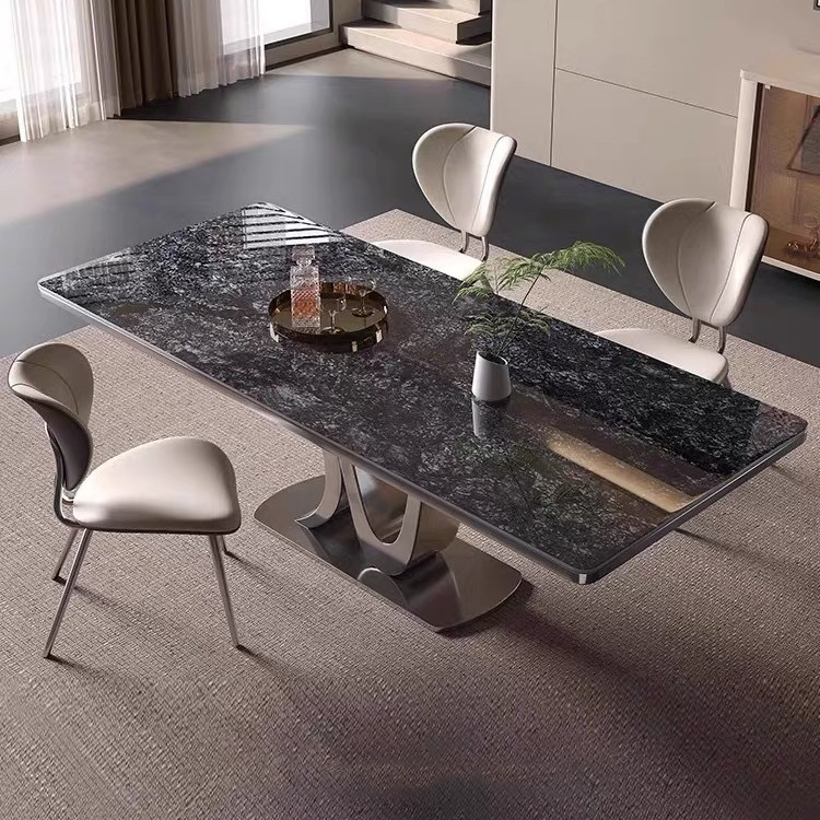 BỘ BÀN ĂN thiết kế tối giản đậm chất Ý. Mặt bàn hình chữ nhật, khung chân tạo hình chữ N độc đáo. Mặt đá ceramic, khung chân thép mạ titan màu đen. Sản phẩm đi kèm ghế.