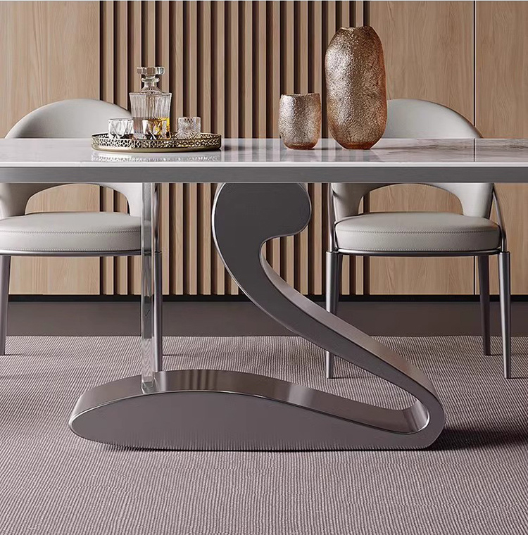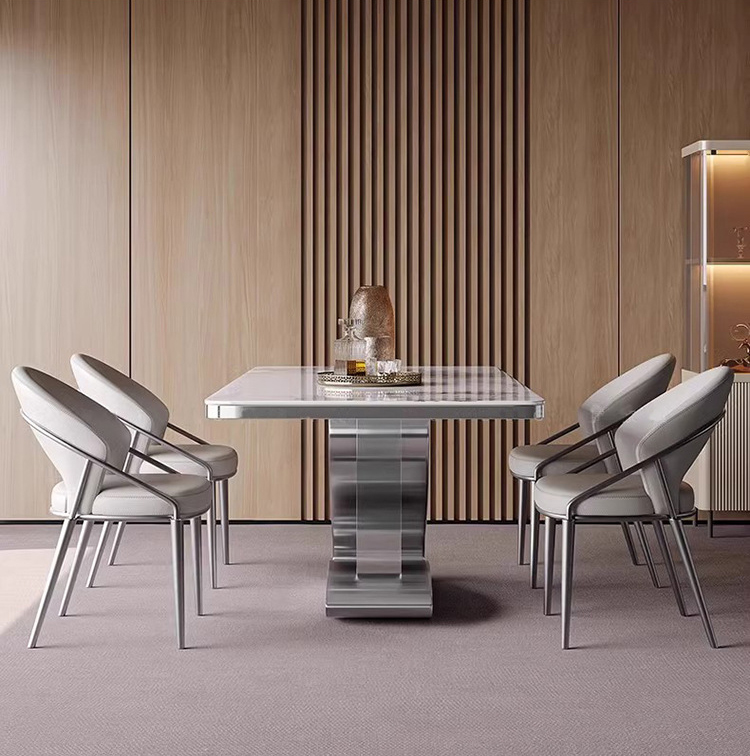 bộ bàn ăn nhập khẩu sử dụng đá phiến cao cấp, có độ cứng vượt trội và khả năng chống trầy xước, chịu nhiệt hiệu quả. Bề mặt mịn màng, sáng bóng giúp dễ dàng vệ sinh, luôn giữ được nét sang trọng cho không gian bếp. Khung bàn được chế tác từ thép không gỉ chất lượng cao, giúp sản phẩm bền vững theo năm tháng mà vẫn giữ nguyên vẻ tinh khôi ban đầu.