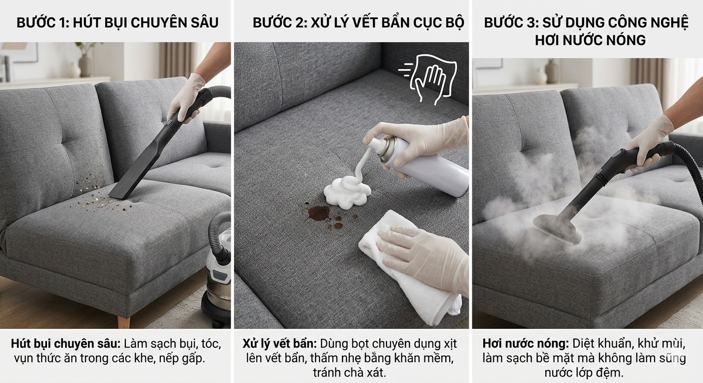 Thay vì dùng nước lạnh, công nghệ hơi nước nóng giúp diệt khuẩn và làm sạch bề mặt mà không gây sũng nước cho lớp đệm bên trong. Đây là cách tốt nhất để khử mùi cho các mẫu sofa giường nhập khẩu.