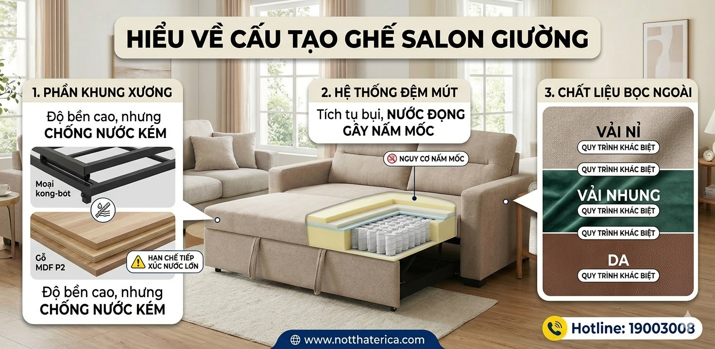 Ghế sofa giường có hệ thống ray trượt và bản lề kim loại để chuyển đổi trạng thái. Việc đổ nước trực tiếp hoặc dùng quá nhiều nước xà phòng sẽ khiến các chi tiết kim loại dễ bị oxy hóa, dẫn đến tình trạng kẹt rít khi thao tác. Đối với phần khung gỗ kỹ thuật, độ ẩm quá cao sẽ làm giảm tuổi thọ của sản phẩm.