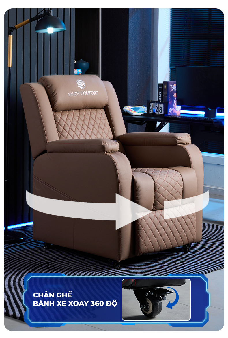 Sofa sở hữu khả năng xoay 360 độ mượt mà nhờ hệ thống trục xoay cao cấp. Người dùng có thể dễ dàng xoay hướng theo ý muốn mà không cần di chuyển ghế. Bánh xe có cơ chế khóa an toàn, giúp cố định chắc chắn khi bạn muốn thư giãn hoặc nghỉ ngơi ở một vị trí nhất định.