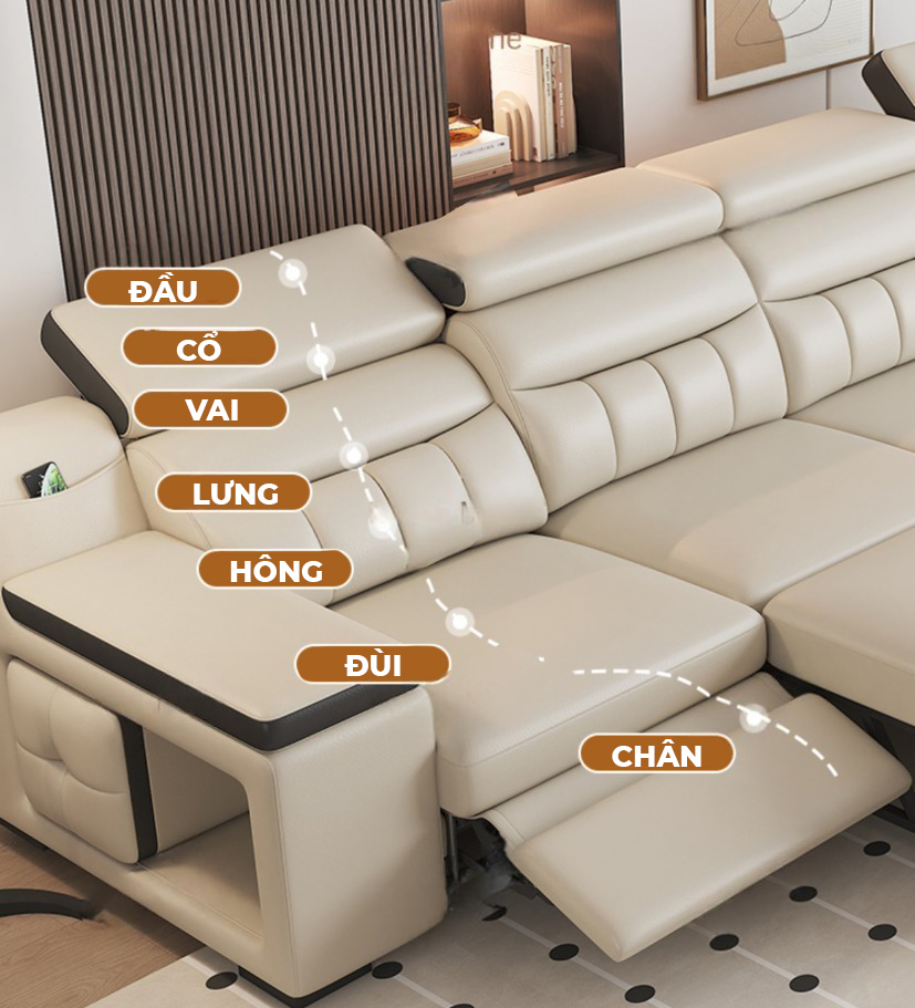 Ghế sofa được thiết kế theo tiêu chuẩn công thái học, với phần tựa lưng, đệm ngồi và gác chân được tính toán chuẩn xác để ôm sát cơ thể, hỗ trợ giảm áp lực tại các vùng vai, cổ, lưng và chân. Nhờ đó, bạn luôn cảm nhận được sự thư giãn tối đa, thoải mái trọn vẹn trong mọi tư thế – từ làm việc, đọc sách đến giấc ngủ sâu an lành mỗi ngày.