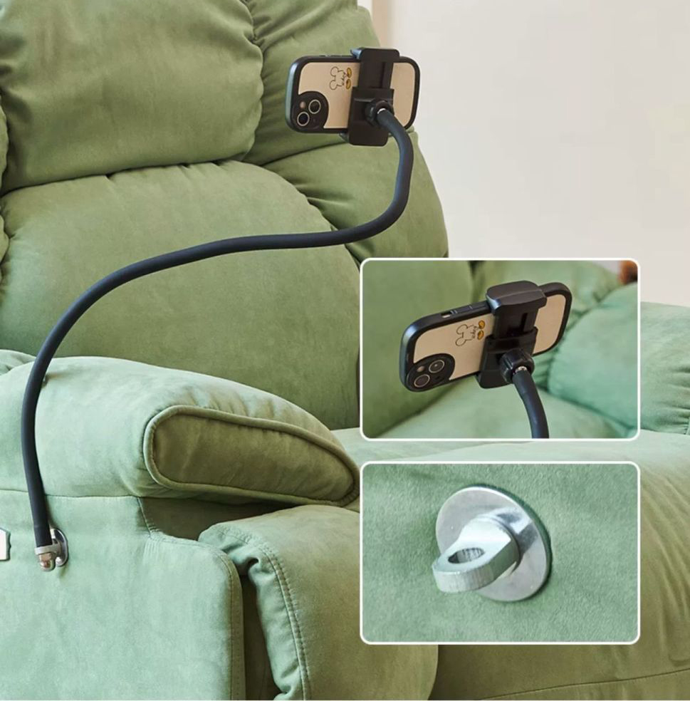 Điểm cộng rất “đáng giá” của mẫu ghế này là giá đỡ điện thoại linh hoạt, giúp bạn xem video, lướt mạng xã hội, làm việc online hay gọi video call mà không phải cầm thiết bị. Đây là trang bị cực kỳ hữu ích cho người hiện đại, đặc biệt là trong những khoảnh khắc thư giãn cá nhân.