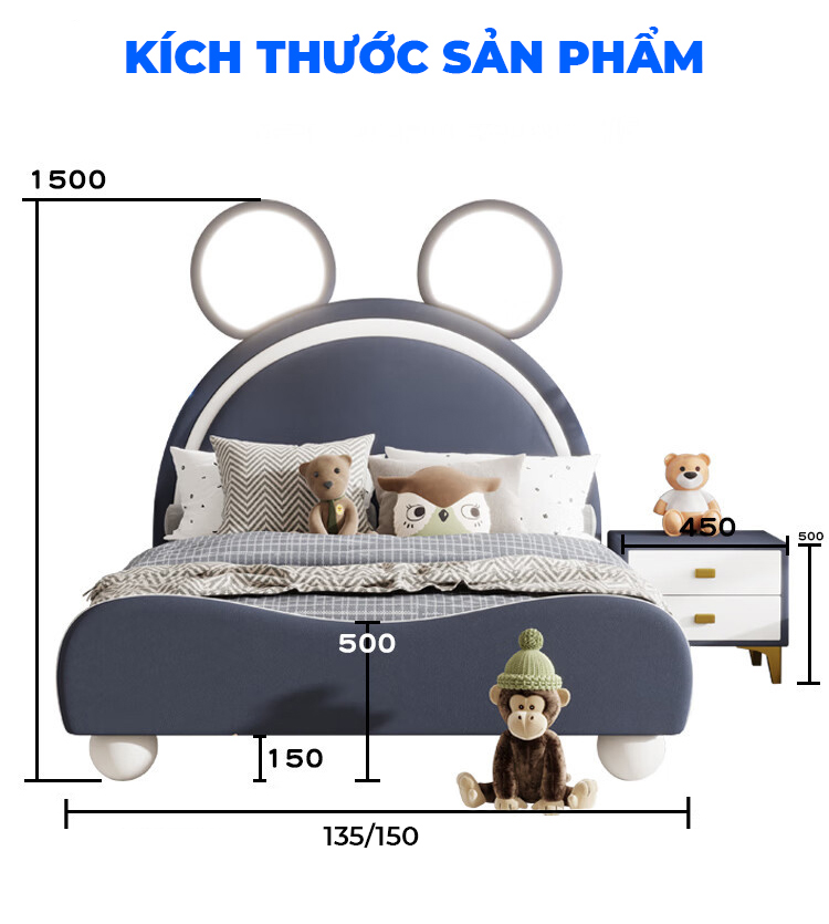 thiết kế độc đáo, chất liệu cao cấp và tính năng hiện đại. Với khung gỗ thông nhập khẩu bền chắc, lớp da bọc mềm mại sang trọng và đèn LED tiện ích, sản phẩm không chỉ mang lại giấc ngủ ngon mà còn là điểm nhấn ấn tượng cho phòng ngủ của bé.