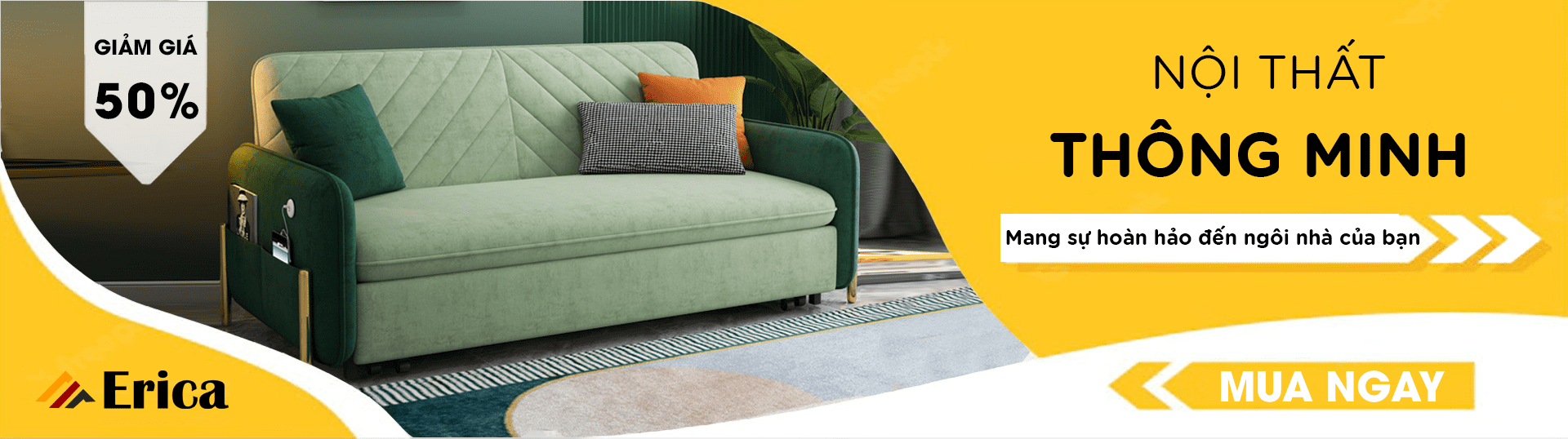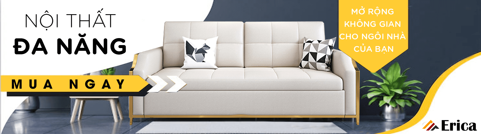 Từ một phòng khách sang trọng trở thành một phòng ngủ ấm cúng một cách nhanh chóng & ngược lại. Ý tưởng này có khiến bạn thích thú? Không mất thời gian dọn dẹp, không tốn kém tiền bạc để sắm sửa thêm nhiều món đồ, bạn vẫn có thể thực hiện ý tưởng của mình chỉ với “Siêu Nội Thất” Sofa Giường Thông Minh Đa Năng ERICA – E2.