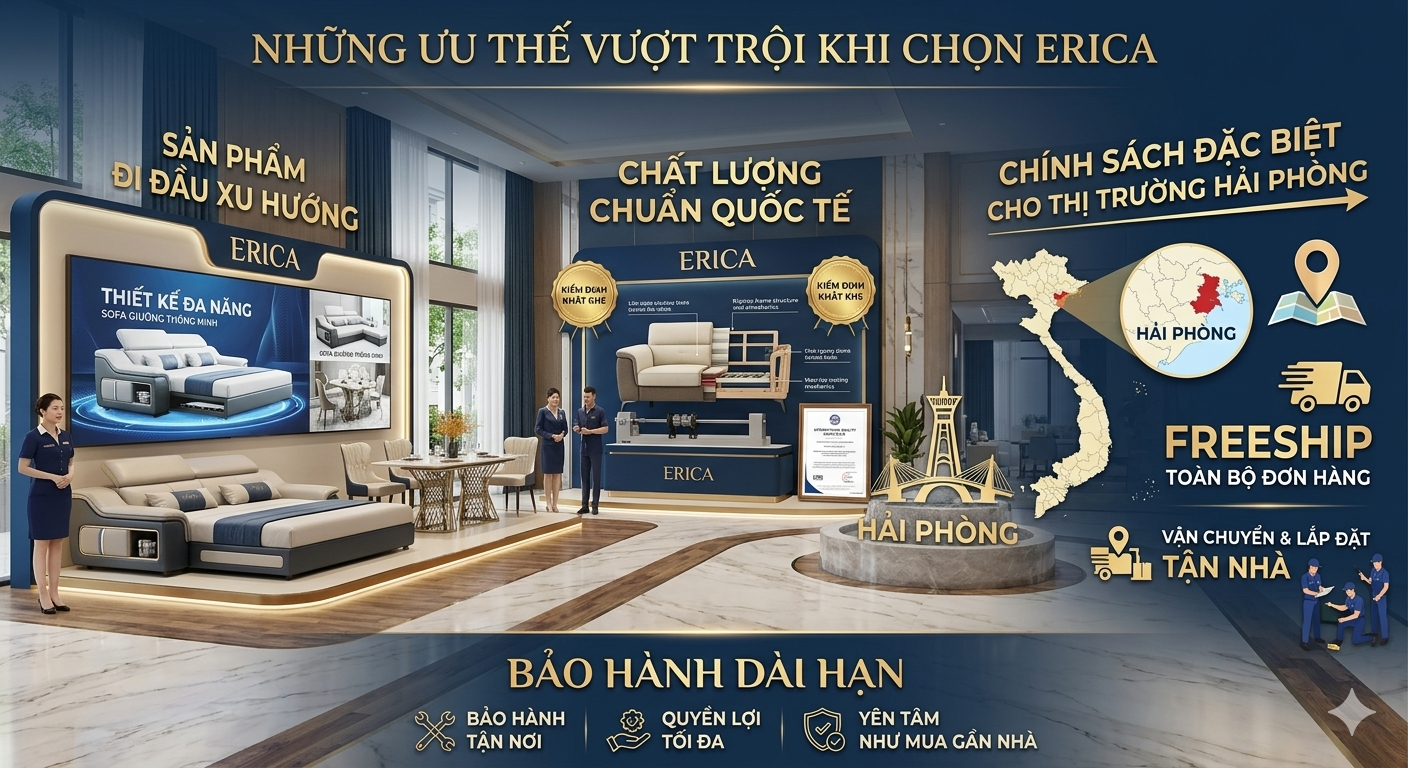 Chính sách đặc biệt cho thị trường Hải Phòng: Hiểu được khoảng cách địa lý, Erica triển khai chương trình Freeship toàn bộ đơn hàng về Hải Phòng. Bạn chỉ cần chọn mẫu, việc vận chuyển và lắp đặt tận nhà đã có đội ngũ chuyên nghiệp của chúng tôi lo.