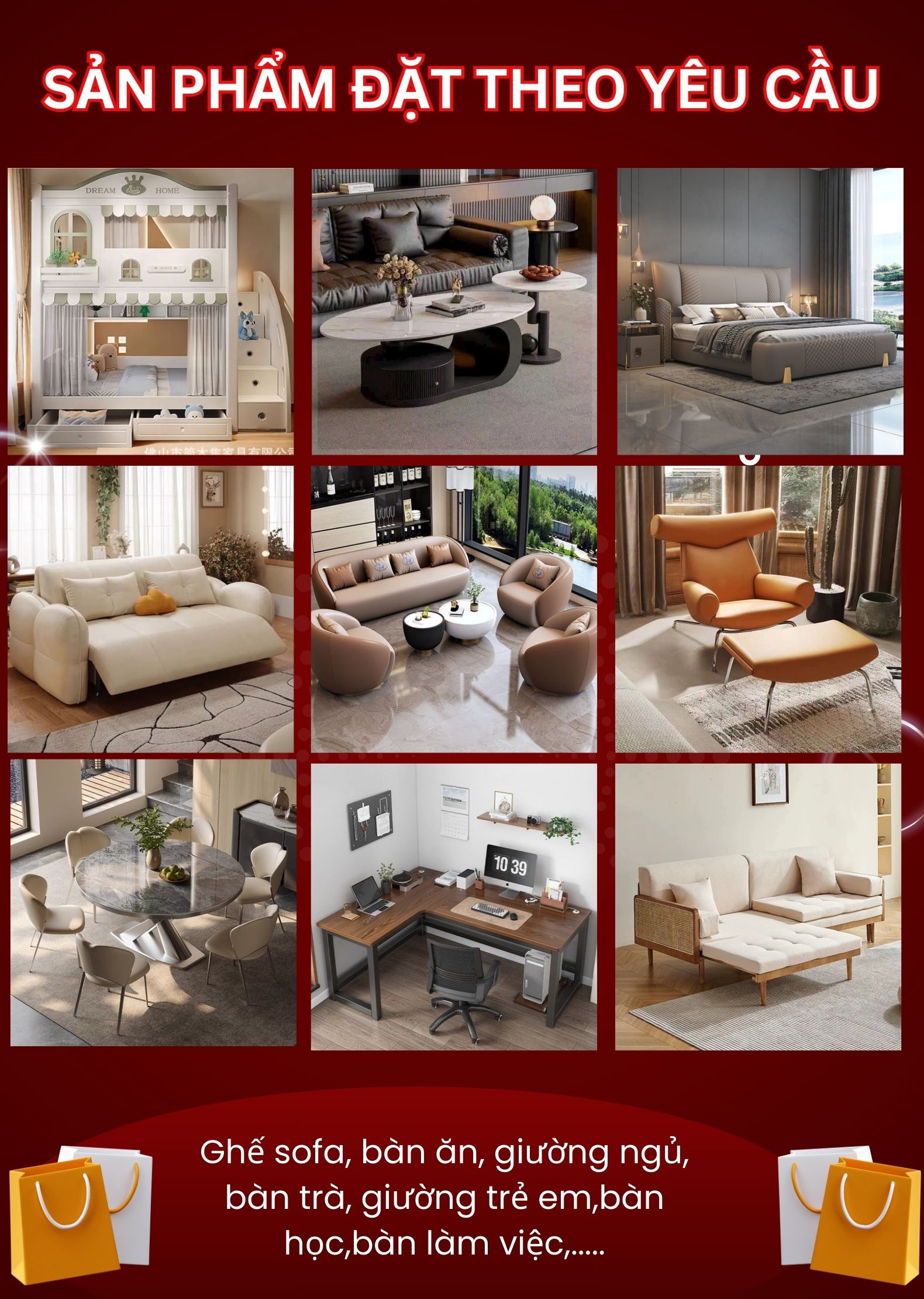 Nhận đóng nội thất theo mẫu yêu cầu, phục vụ đa dạng không gian như nhà ở, phòng họp cơ quan, phòng bếp, bệnh viện, trường học… Quý khách vui lòng liên hệ trực tiếp với chúng tôi để trao đổi mẫu sản phẩm và các yêu cầu cụ thể. Đội ngũ sẽ tiếp nhận thông tin và phản hồi trong thời gian sớm nhất.