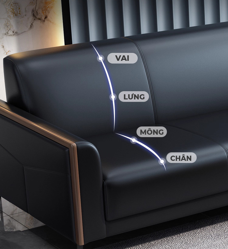 Bề mặt được bọc bằng lớp da nhập khẩu chất lượng cao, có độ mịn, thoáng khí và dễ dàng vệ sinh. Không chỉ tạo nên vẻ ngoài sang trọng, lớp da này còn giúp sofa bền đẹp hơn, chống thấm và hạn chế bám bụi trong quá trình sử dụng.
