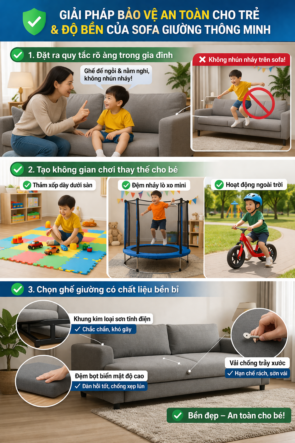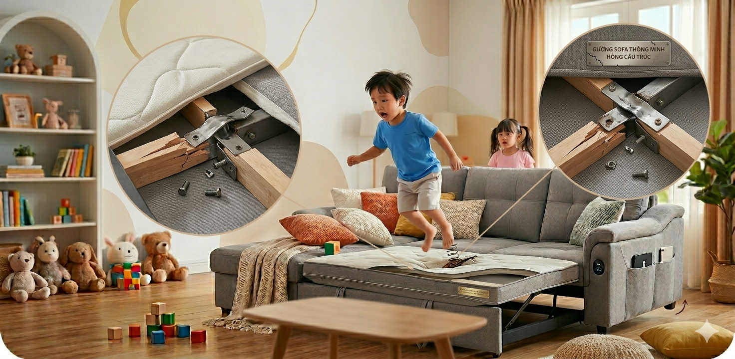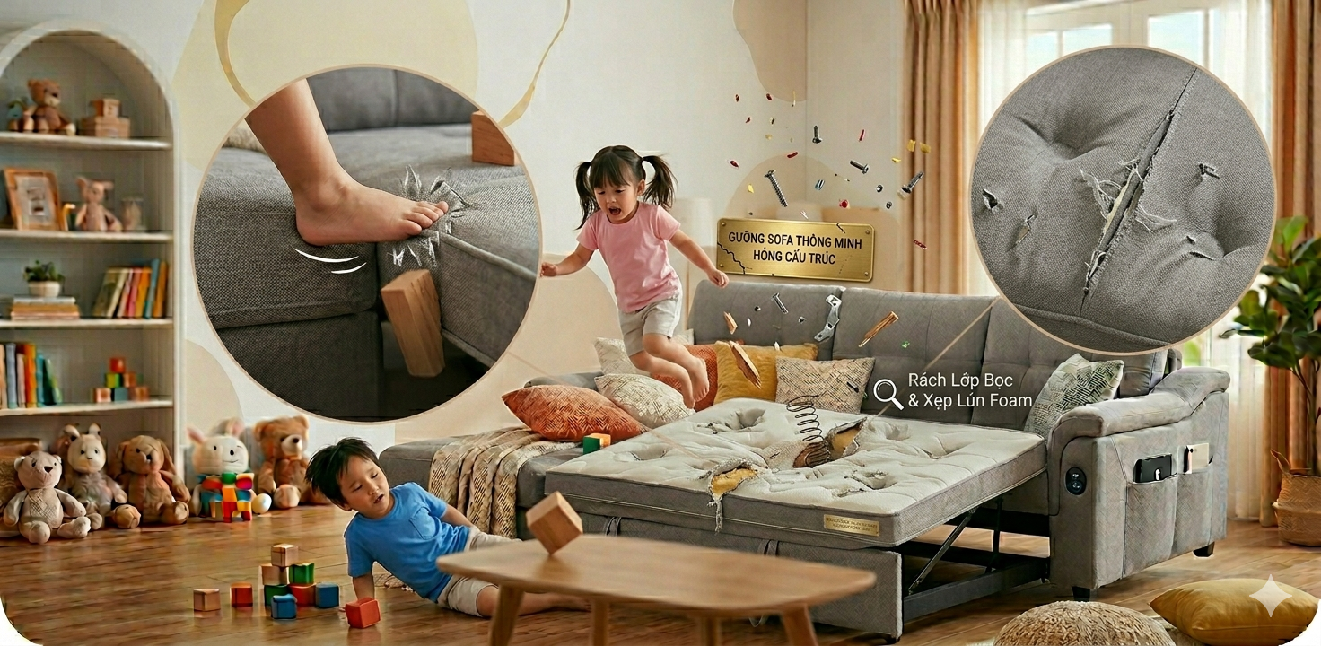 Tóm lại, câu trả lời cho câu hỏi "Trẻ em nhún nhảy trên sofa giường thông minh có sao không?" chắc chắn là CÓ HẠI. Nó không chỉ gây nguy cơ mất an toàn cho bé mà còn tàn phá cấu trúc của món đồ nội thất đắt tiền trong nhà bạn. Hãy thiết lập thói quen sử dụng đồ đạc văn minh cho con trẻ và đừng quên đầu tư vào những sản phẩm chất lượng ngay từ đầu để tiết kiệm chi phí sửa chữa, thay mới về lâu dài.