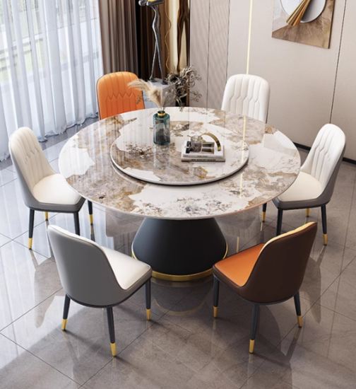 Điểm nhấn đặc biệt của bàn ăn tròn 6 ghế chắc chắn nằm ở phần chân bàn. Chân bàn này có thiết kế hình trụ độc đáo, được làm từ kim loại sơn tĩnh điện không gỉ kết hợp inox mạ vàng sang trọng, không chỉ mang đến độ bền – độ chắc chắn cho sản phẩm đồng thời giúp tổng thể bộ bàn thêm phần duyên dáng và bắt mắt.